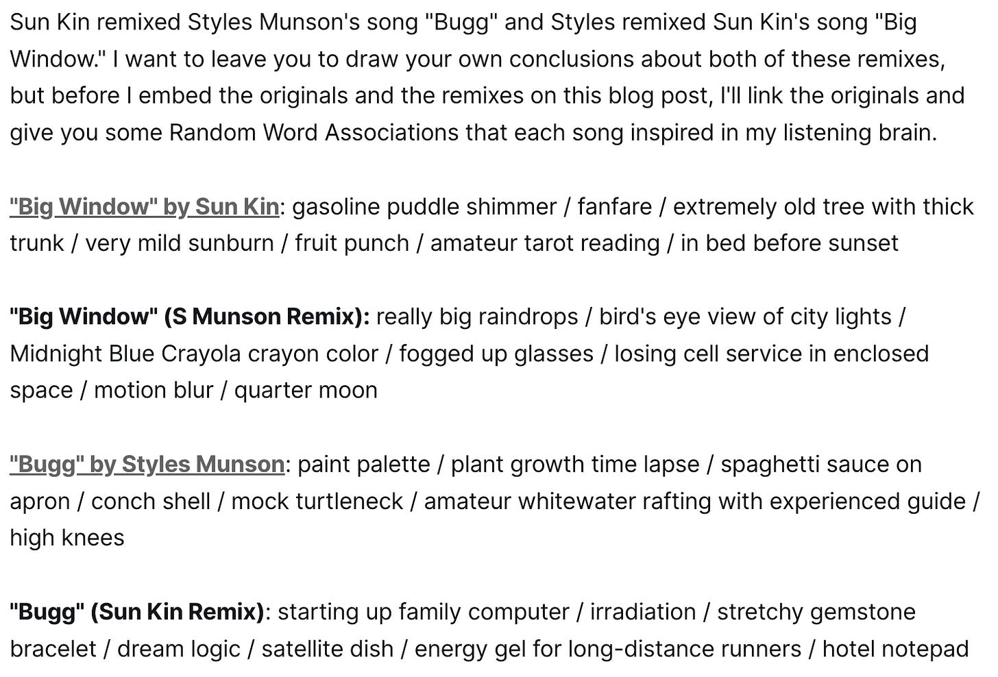 I have been deep in remixing world. I did a sort-of-Daft-Punk remix to one of my favorite songs by my buddy Justin (Planet 81). The stems were already so rich and warm but I couldn’t help but add my own live bass guitar, backing vocals, and for special attention to theme of ‘things that were available in 1981’, a lil line on the Minimoog. I also recently did a remix baton-pass with my buddy Styles Munson for my friend Molly’s blog I Enjoy Music, for which she wrote an incredible writeup. You should read the whole thing, but my favorite part is this word association prompt she had for the originals and the remixes: